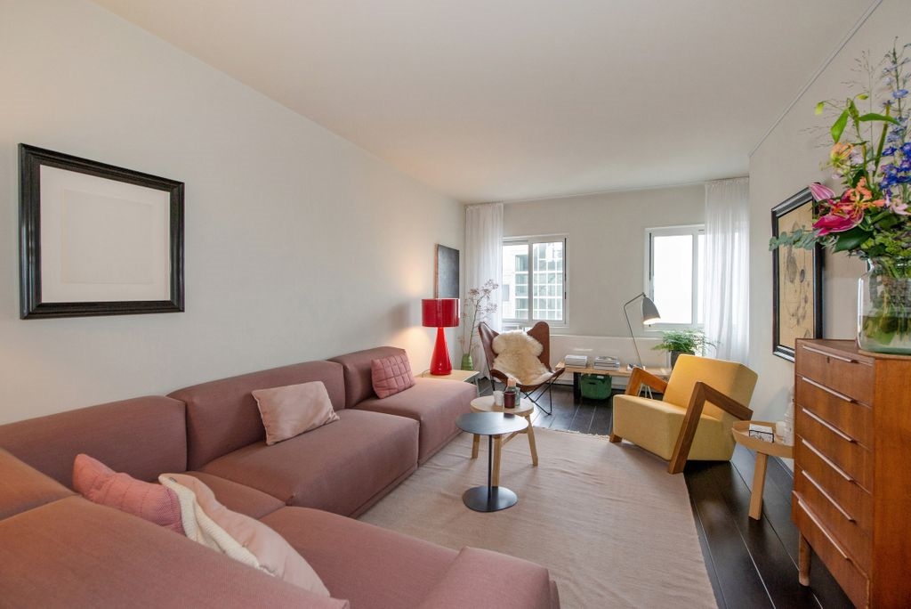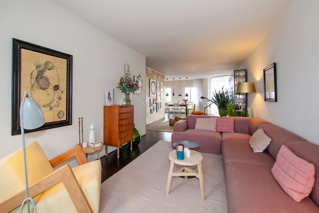 Entrance apartment on the fourth floor: large hall with spacious wardrobe/storage cupboard, modern toilet with washbasin, separate room with space for washing machine/dryer, spacious living/dining room with hardwood floor and conservatory, unobstructed view of the sea and the skyline of The Hague ! Modern open kitchen with a 5-burner gas stove (Smeg), extractor hood and a slate floor. Spacious bedroom with beautiful pine wooden floor, deep closet, spacious walk-in closet and again a beautiful view over the boulevard, the beach and the sea. Modern luxury bathroom with bath, shower, toilet, sink and radiator.
