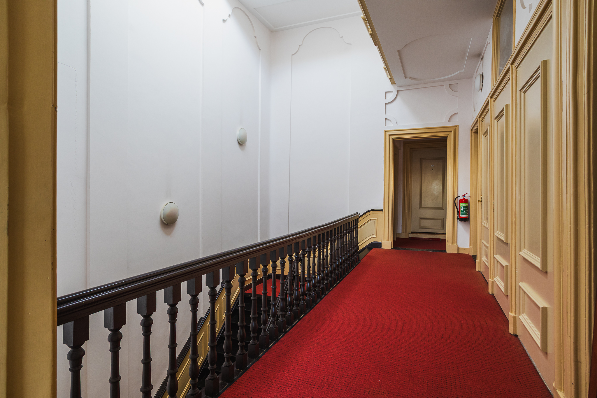 Through the central entrance with hotel appearance and videophone you reach the apartment on the second floor. The hall leads to the spacious, bright living room on the corner, where large windows and almost three-metre-high ceilings provide a sea of daylight and a magnificent view of the monumental facades of the street. The living room is beautifully finished with a high-quality laminate floor, a stylish radiator cover and a wall with elegant niches for art and TV.