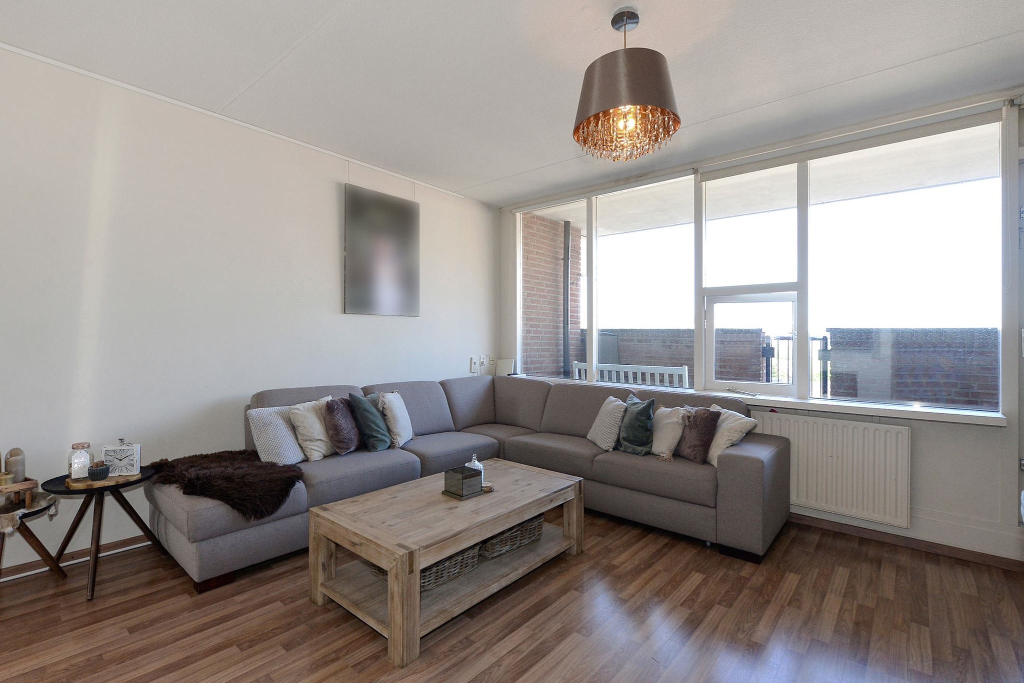 Indeling: entree via gesloten portiek met bellentableau, trappenhuis en lift naar 6e etage.: entree, gang met een kast, meterkast, modern zwevend toilet met fonteintje, 3 slaapkamers, resp. ca. 2.75 x4.40m, ca. 2.10 x 3.40m en ca. 2.75 x 4.30m, moderne badkamer met grote douchehoek met fraaie glazen deur, woonkamer met ruim zonnig balkon, doorloop naar keuken met bijkeuken waar grote ijskast en wasmachine en droger opstelplaats zich bevinden. Keuken voorzien van diverse inbouwapparatuur zoals; inbouw vaatwasser en combi oven/ magnetron, vier pits gasfornuis en voldoende kastruimte aanwezig. Seperate fietsenberging in de onderbouw.