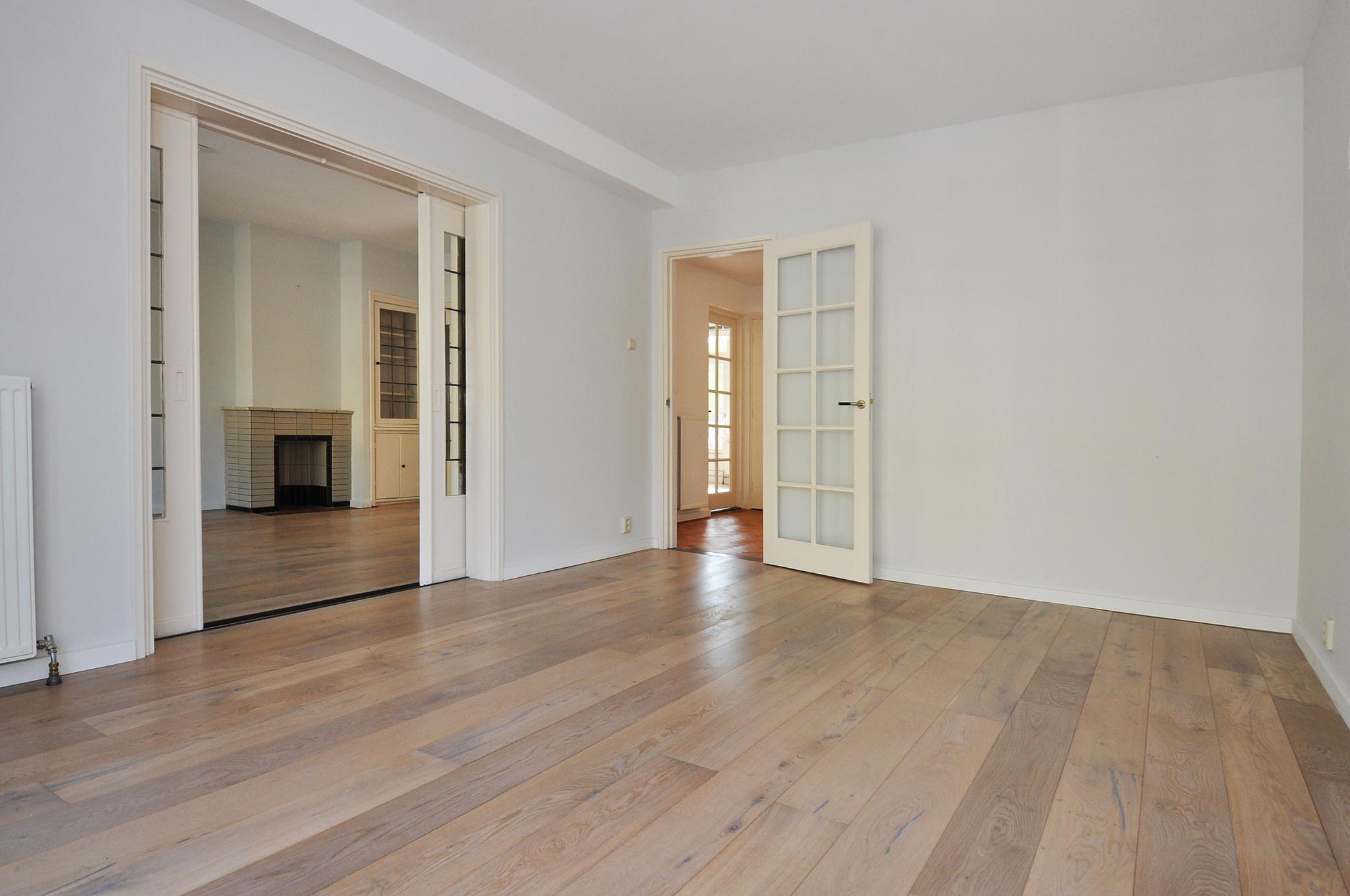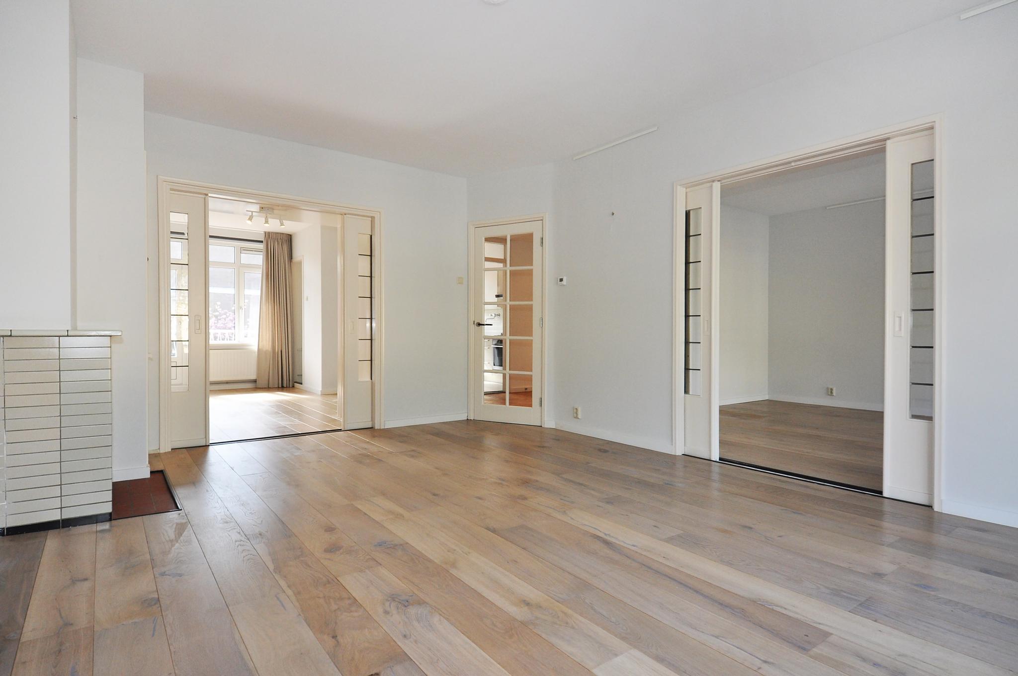 shared entrance, stairs/elevator to the 1st floor, entrance apartment, spacious hall with wardrobe, meter closet and a modern toilet with washbasin, front room (approx. 575 x 405) with original fireplace, cupboard and sliding doors to front side room (approx. 470 x 380) with French balcony, back room (490 x 340) with cupboards and access to the bathroom with walk-in shower, washbasin and bathroom cabinet, balcony at the back (approx. 415 x 115), new fully equipped kitchen with access to a second balcony (approx. 245 x 120) with a closet.