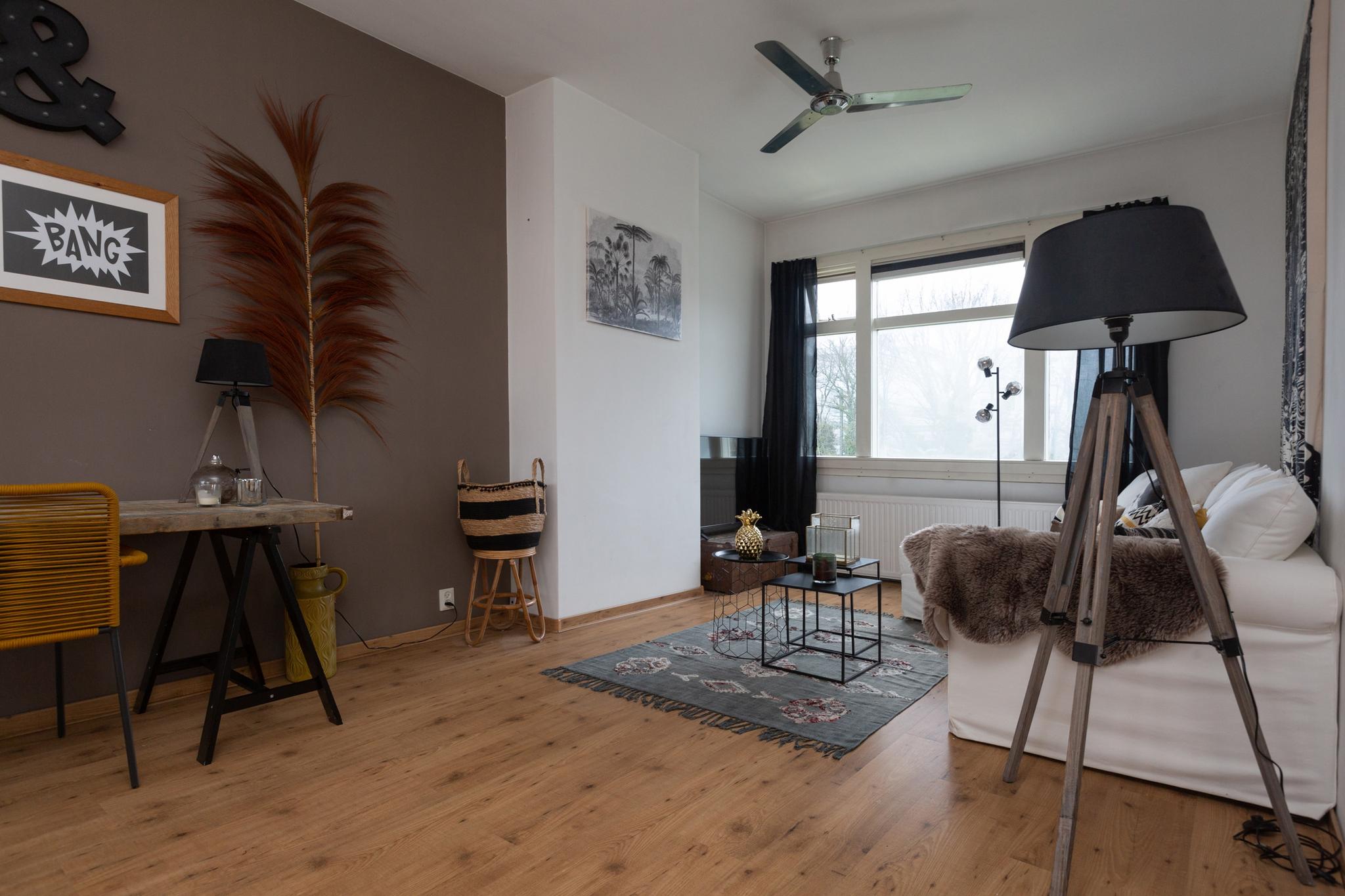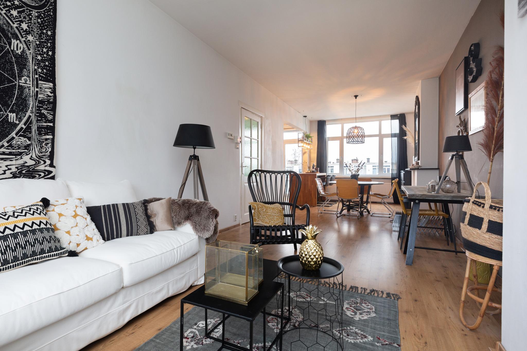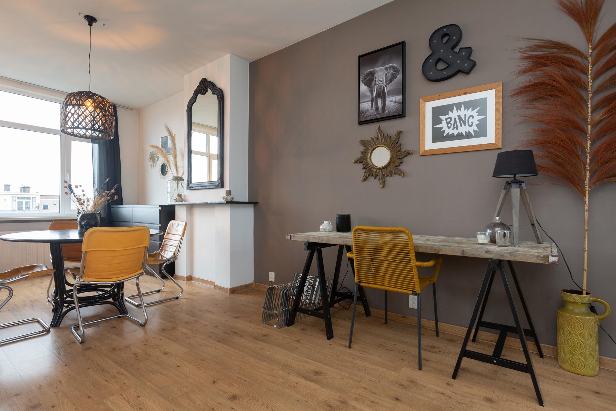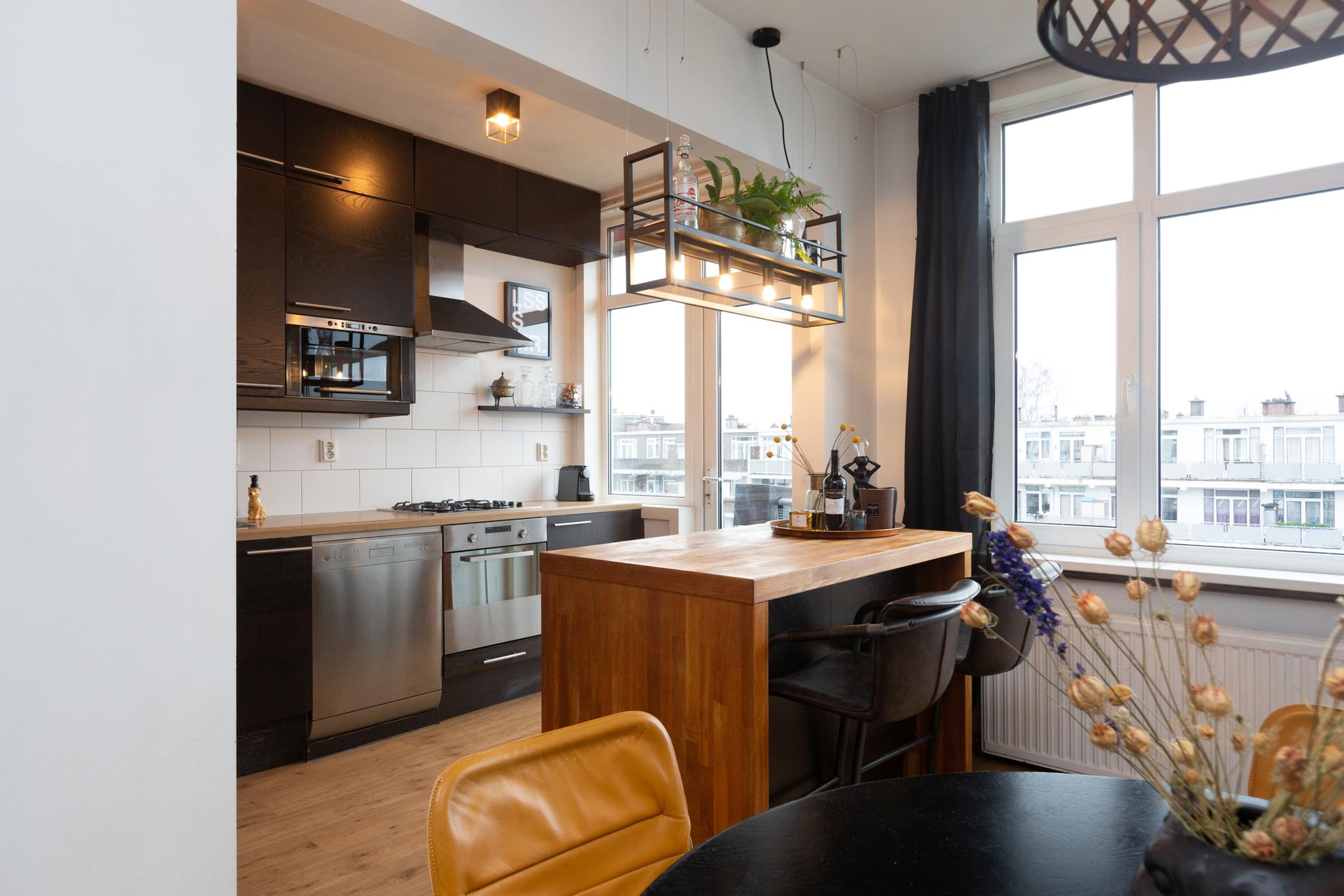 Dan kom je in de ruime en lichte woon-/eetkamer van ca. 32m2. Deze is voorzien van een laminaatvloer en achter is de keuken doorgebroken en voorzien van een nette keuken. Deze is voorzien van een laminaatvloer en achter is de open keuken, met een los eiland en diverse (inbouw)apparatuur: grote koelvriescombinatie, 4-pits gaskookplaat, vaatwasser, afzuigkap, nespresso koffiemachine, hete-lucht oven en een magnetron. Via de keuken kun je naar het balkon van ca. 6m2. Langs de keuken is de slaapkamer aan de achterzijde bereikbaar. Deze slaapkamer is ca. 8m2 en is voorzien van een inbouwkast met aansluiting voor de wasmachine. Deze kamer is ook voorzien van toegang tot het balkon.