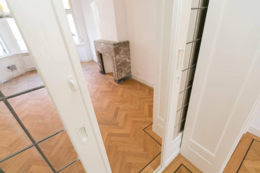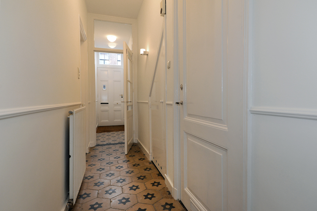 Via de centrale entree met hoteluitstraling en videofoon bereikt u het appartement op de tweede etage. De hal leidt naar de royale, lichte woonkamer op de hoek, waar grote ramen en bijna drie meter hoge plafonds zorgen voor een zee aan daglicht en een schitterend uitzicht op de monumentale gevels van de straat. De woonkamer is fraai afgewerkt met een hoogwaardige laminaatvloer, een stijlvolle radiatorenombouw en een wand met elegante nisjes voor kunst en tv.